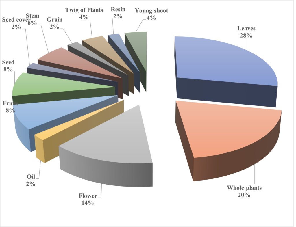 The present study documented a total of 49 plant species under 39 families which are associated with the socio- culture and religious beliefs among the bodo tribe. These plant species are used regularly by them in various socio-culture and religious activities. Among the different plants’ parts, 28 % of leaves, 20 % of whole plants and 14 % Flowers are found dominant used in socio- culture and religious aspects by the bodo tribes in Dhemaji district. The plant species of the present study are arranged in alphabetically with their Botanical name family, Bodo name and uses as shown in Table 1.