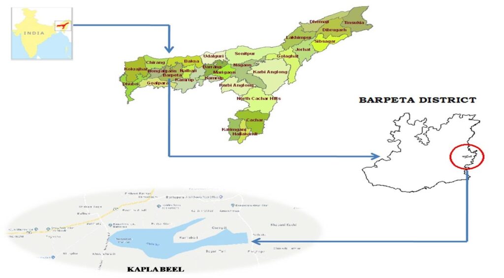 The Kapla Beel is a perennial freshwater wetland located at Sarthebari revenue circle of Barpeta District of Assam. It lies at the intersection of 26°15′-26°30’N latitude and 91°0′-91°15’E longitude, covering an area of about 91 hectares (Fig. 1). It is surrounded by five villages viz., Haldibari and Kaldipathar in East, Barkapla Gaon in West, Kamarpara Gaon in North, and Salmara Gaon in the South.