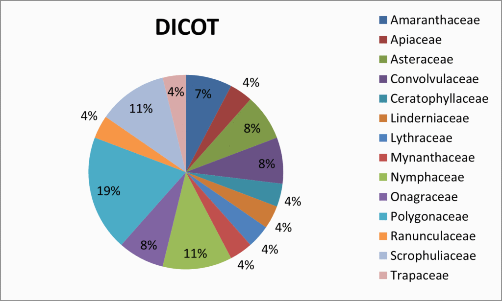 The greater Kapla beel or Wetland complex is the most biodiversity-rich wetland in the Barpeta District of Assam. The beel is very much blessed with the good potential of aquatic resources. An uneven distribution of useful wetland species by plant family has also been found elsewhere in the world (Jain et al., 2011; Naqinezhad et al., 2009; Rasingam, 2010; Saharia & Sarma, 2011). In the present study, I have found both Monocotyledonous and Dicotyledonous plants. Total 14 families from Dicots whereas 11 families from Monocots were recorded. We have recorded 25 species from different families of Dicotyledonous plants and 18 species from different families of Monocotyledonous plants (Table 1, Fig. 1, 2, 3, 4, and 5). From the study, it was seen that the aquatic angiosperms are growing both in and by side of the water bodies. However, the majority of the species are reported from the category of amphibians. There is a fewer number of submerged and free-floating plants in comparison to the marginal emergent and amphibians. However, Eichornia ,Nymphaea, Euryale, etc. show purely aquatic vegetation. From the study, it was noticed that the species abundance was reduced in the monsoon season due to the flood and water which causes the disturbance in their growth and development. Among the dominant species, Eichhornia cressipes is the most dominant species. Trapa natans were dominant during the monsoon period. Ceratophyllum is in the winter season. The study showed that the majority of the species were found more or less throughout all seasons.